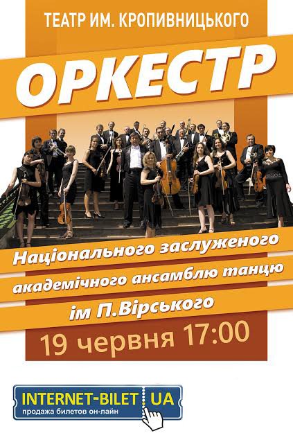 Оркестр ім. П. Вірського состоится 19 июня 2016, 17:00, воскресенье в Академический музыкально-драматический театр им. М.Л. Кропивницкого. С помощью сервиса internet-bilet.ua, Вы сможете с легкостью забронировать, заказать и купить билеты на интересующий Вас концерт, спектакль, оперу, балет, мастер-классы, спортивные и детские мероприятия, оплатив их самым удобным для Вас способом: через интернет банковской картой VISA/MasterCard, наличными или курьером, если сделаете заказ билета c доставкой.