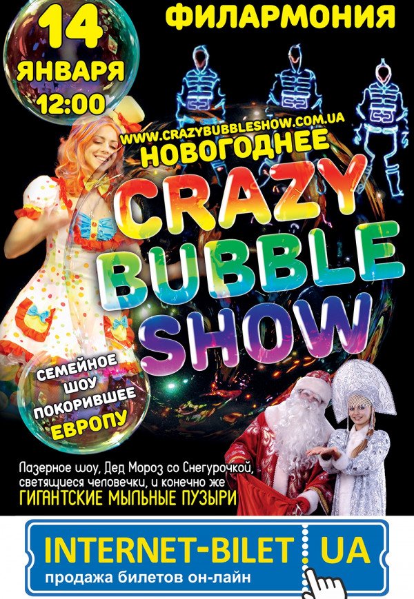 Новогоднее "CRAZY BUBBLE SHOW" состоится 28 января 2017, 12:00, суббота в Кировоградская областная филармония. С помощью сервиса internet-bilet.ua, Вы сможете с легкостью забронировать, заказать и купить билеты на интересующий Вас концерт, спектакль, оперу, балет, мастер-классы, спортивные и детские мероприятия, оплатив их самым удобным для Вас способом: через интернет банковской картой VISA/MasterCard, наличными или курьером, если сделаете заказ билета c доставкой.