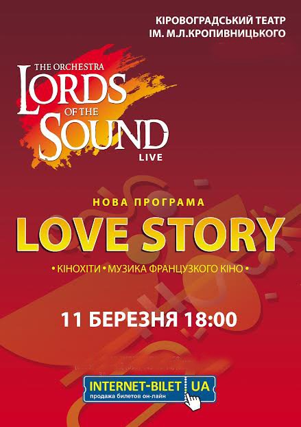 LORDS OF THE SOUND «Love Story» відбудеться 11 березня 2016, 18:00, п’ятниця в Академічний музично-драматичний театр ім. М.Л. Кропивницького. За допомогою сервісу internet-bilet.ua, Ви зможете з легкістю забронювати, замовити та купити квитки на концерт, спектакль, оперу, балет, майстер-класи, спортивні та дитячі заходи, що Вас цікавлять, оплативши їх найбільш зручним для Вас способом: через інтернет банківською карткою VISA/MasterCard, готівкою або кур'єром, якщо зробите замовлення квитка з доставкою.
